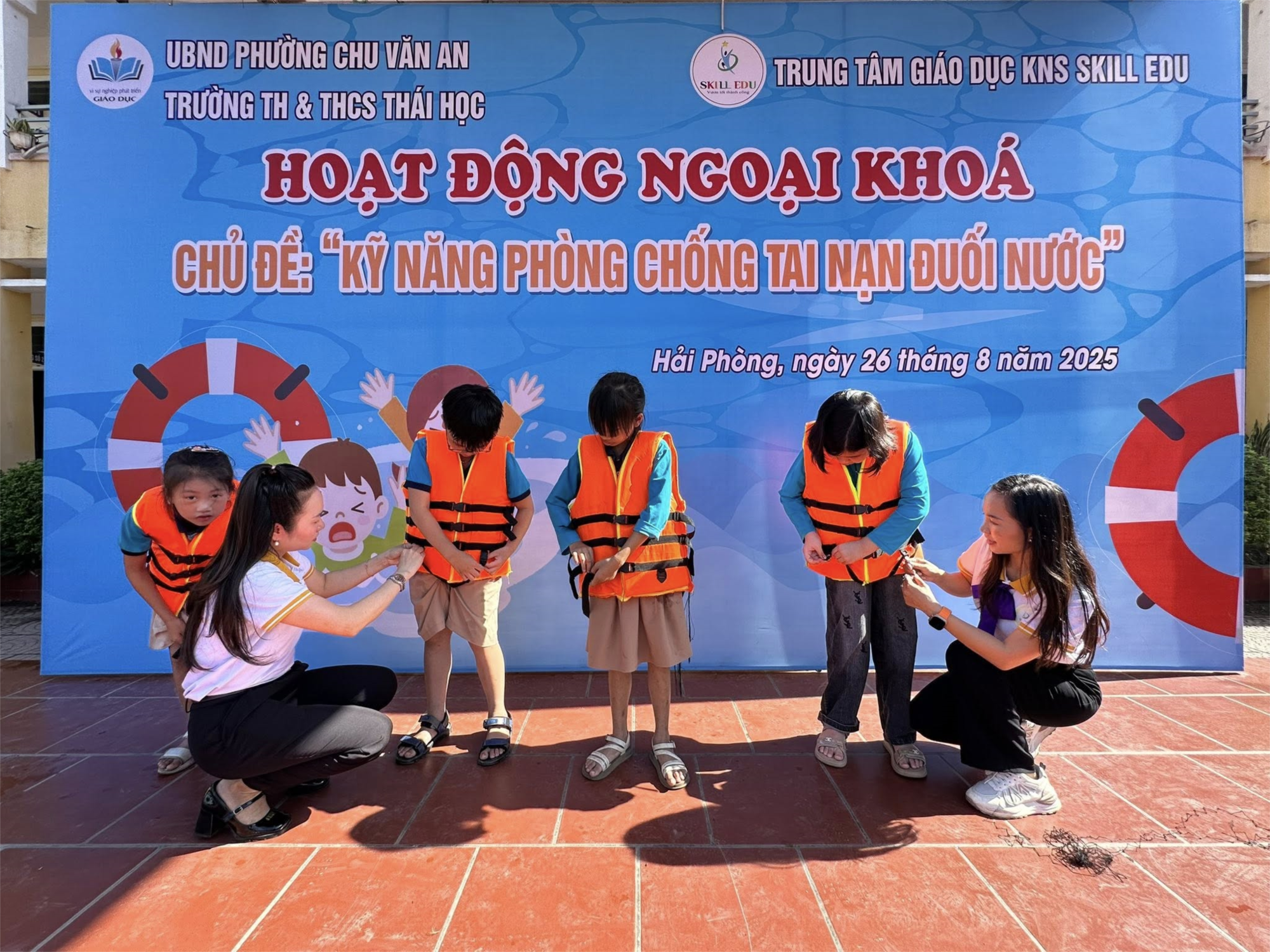 Sáng ngày 26/8/2025, tại sân trường, Trường TH&THCS Thái Học phối hợp với Trung tâm Giáo dục Kỹ năng sống Skill Edu tổ chức chương trình ngoại khóa với chủ đề “Phòng tránh tai nạn đuối nước” cho toàn thể học sinh.